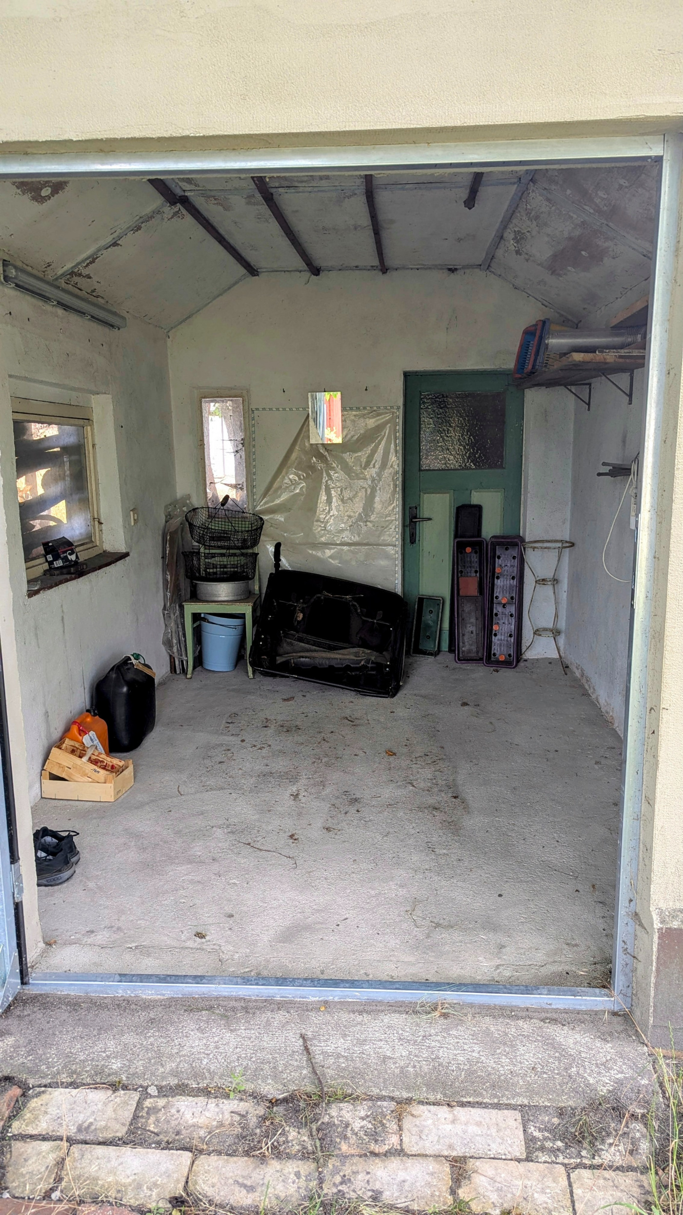 Das Grundstück ist im südlichen Bereich bereits mit einem einfachen Bungalow sowie einem gemauerten Schuppen bebaut. Diese Bestandsgebäude könnten je nach Bedarf erhalten, modernisiert oder entfernt werden, um Platz für eine neue Bebauung zu schaffen. Die Bepflanzung des Grundstücks umfasst mehrere Apfel- und Birnbäume sowie einen groß gewachsenen Walnussbaum.
